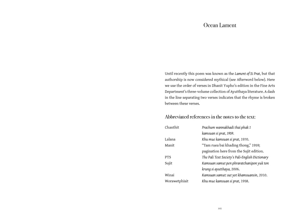 These two poems of love, loss, and landscape, translated into English for the first time, are among Thai literature’s earliest and most celebrated works, dating from around 1500 CE. In Nirat hariphunchai, the author makes a pilgrimage to the great Buddhist reliquary at Lamphun to show his devotion to a lover and his religion. In Ocean Lament, the author flees from Ayutthaya for reasons unknown and travels down the Chaophraya River, marveling at the landscape and howling in physical distress over a lover left behind. Both works are celebrated for their emotional intensity and inventiveness in their expression. They are recognized as pioneers of the nirat, the most distinctive genre in later Thai poetry.