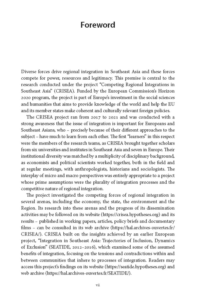 This study was written for the École française d’Extrême-Orient (EFEO) in the framework of the project “Competing Regional Integrations in Southeast Asia” (CRISEA, 2017–2021) funded by the European Commission. CRISEA was a successor project to the project “Integration in Southeast Asia: Trajectories of Inclusion, Dynamics of Exclusion” (SEATIDE, 2012–2016), also funded by the European Commission.