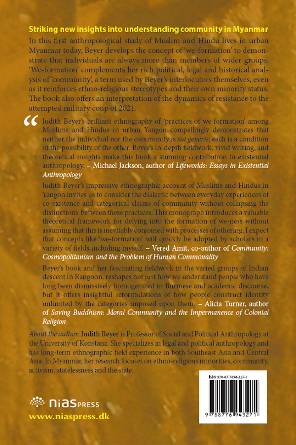 “Judith Beyer’s impressive ethnographic account of Muslims and Hindus in Yangon invites us to consider the dialectic between everyday experiences of co-existence and categorical claims of community without collapsing the distinctions between these practices. This monograph introduces a valuable theoretical framework for delving into the formation of we-ness without assuming that this is inevitably conjoined with processes of othering. I expect that concepts like ‘we-formation’ will quickly be adopted by scholars in a variety of fields including myself.” — Vered Amit, Professor of Sociology and Anthropology at Concordia University, Montreal, Canada