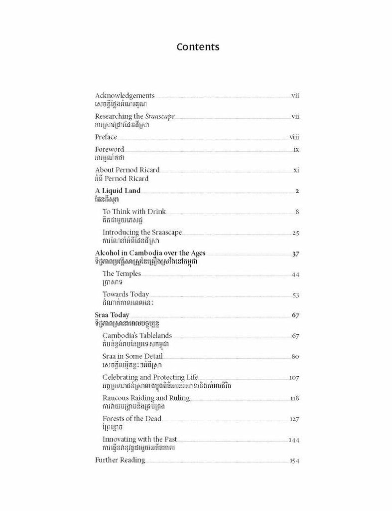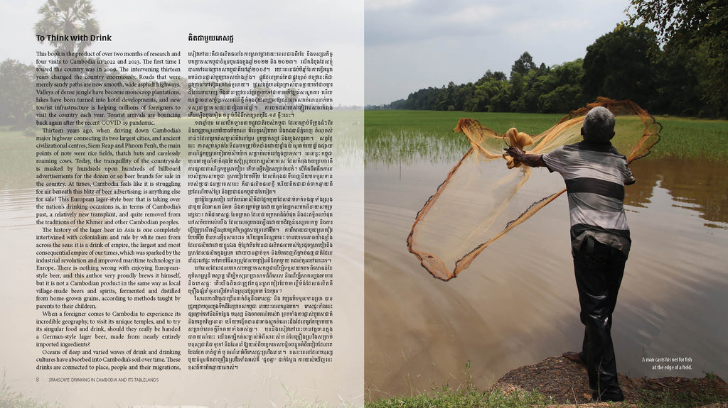 កម្ពុជាគឺជាដែនដីទឹក។ វាជាប្រទេសមួយដែលមានបឹងជាច្រើនប្រៀបបានដូចជាសួតឬដង្ហើមរស់ ដែលដំបូងឡើយដែនដីនេះបង្កើតឡើងដោយទឹក និងជាកន្លែងដែលមនុស្សបង្កើតទឹកប្រកបដោយភាពប៉ិនប្រសប់។ ភេសជ្ជៈគ្រឿងស្រវឹងនៅកម្ពុជាដែលគេស្គាល់ជាទូទៅថា ស្រា បង្កប់នូវសារៈសំខាន់យ៉ាងខ្លាំងសម្រាប់វប្បធម៌ម្ហូបអាហារ និងភេសជ្ជៈរបស់ប្រទេសនេះ ប៉ុន្តែ វាទទួលបានការយកចិត្តទុកដាក់តិចតួចប៉ុណ្ណោះពីសំណាក់អ្នកនិពន្ធនិងអ្នកស្រាវជ្រាវនានា។ សៀវភៅនេះកើតឡើងពីការប្រឹងប្រែងជំនះនូវការប្រឈមនេះប្រកបដោយមោទនភាព ជាមួយនឹងការបង្ហាញបែបនិទានកថាប្រវត្តិសាស្ត្រនៃភេសជ្ជៈគ្រឿងស្រវឹងនៅក្នុងប្រទេសកម្ពុជា និងការពណ៌នាអំពីស្រាដែលផលិតនិងទទួលទានដោយជនជាតិនេះនាពេលបច្ចុប្បន្ន។ ផ្អែកលើការចុះស្រាវជ្រាវដោយផ្ទាល់ដល់ទីតាំងចំនួនបីលើក និងការសិក្សាស្រាវជ្រាវអស់រយៈពេល៣ ខែ ក្នុងអំឡុងឆ្នាំ ២០២២-២០២៣ អ្នកនិពន្ធ Luke Corbin បានយកបទពិសោធន៍ផលិតស្រាដ៏មានជំនាញវិជ្ជាជីវៈរបស់គាត់ បូកផ្សំនឹងជំនាញស្រាវជ្រាវដែលទទួលបានពីសៀវភៅ «មរតកភេសជ្ជៈនៃប្រទេសមីយ៉ាន់ម៉ា» (Heritage Drinks of Myanmar) ក្នុងឆ្នាំ២០២២ របស់គាត់ ដើម្បីចងក្រងជាឯកសារបន្ថែមមួយទៀតអំពីភេសជ្ជៈតែមួយគត់ និងវប្បធម៌ផឹកស្រារបស់ប្រទេសអាស៊ីអាគ្នេយ៍មួយ អមដោយរូបថតពណ៌ធម្មជាតិជាង១៣០រូបភាព។