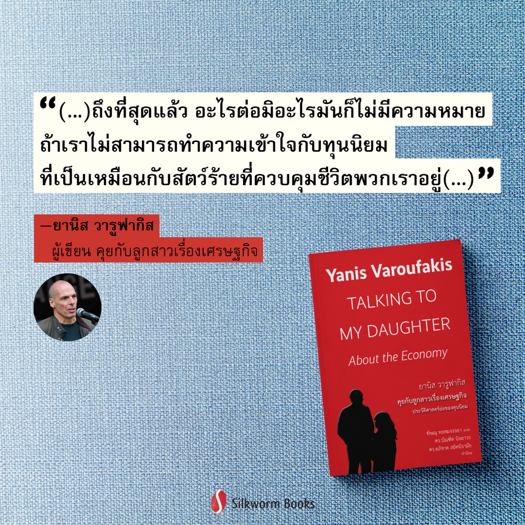 ศาสตราจารย์ ดร.ยานิส วารูฟากิส (Yanis Varoufakis) นักเศรษฐศาสตร์ นักวิชาการ นักการเมือง อดีตอาจารย์มหาวิยาลัยเคมบริดจ์และมหาวิทยาลัยซิดนีย์ เลขาธิการ พรรค MeRA25 รัฐมนตรีกระทรวงการคลังกรีซ (ม.ค.–ก.ค. 2558) อธิบาย เศรษฐกิจแก่บุตรสาวอายุสิบสองปี ด้วยมุมมองด้านประวัติศาสตร์ เศรษฐศาสตร์ การเมือง พัฒนาการของสังคม เรียงลำดับการนำเสนออย่างน่าสนใจ เริ่มจากปัญหา ความเหลื่อมล้ำพัฒนาการของระบบตลาด ระบบทุนนิยม การทำงานของระบบธนาคาร ที่เป็นกลไกของทุนนิยม การก่อหนี้และการทำกำไรที่เป็นพื้นฐานของความมั่งคั่ง บทบาทของแรงงานที่สร้างกำไรส่วนเกินให้กับเจ้าของทุน พัฒนาการของเทคโนโลยีที่ ทำให้ส่วนของกำไรยิ่งเพิ่มมากขึ้น เรื่องการเมืองกับเศรษฐกิจที่เป็นสองอำนาจที่แยกกัน ไม่ออก และผลที่ระบบทุนนิยมมีต่อสิ่งแวดล้อมและความเป็นอยู่ของคนในสังคม และ กลับมาจบที่ปัญหาความเหลื่อมล้ำซึ่งก็คือสิ่งที่กำลังเกิดขึ้นในเศรษฐกิจโลกขณะนี้ เป็นความพยายามที่จะให้ผู้อ่านเข้าใจเรื่องต่างๆ ที่เกิดขึ้นอย่างเป็นระบบ และให้ข้อคิด มากมายเกี่ยวกับปัญหาเศรษฐกิจในปัจจุบัน