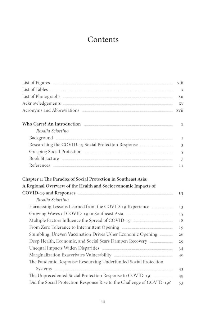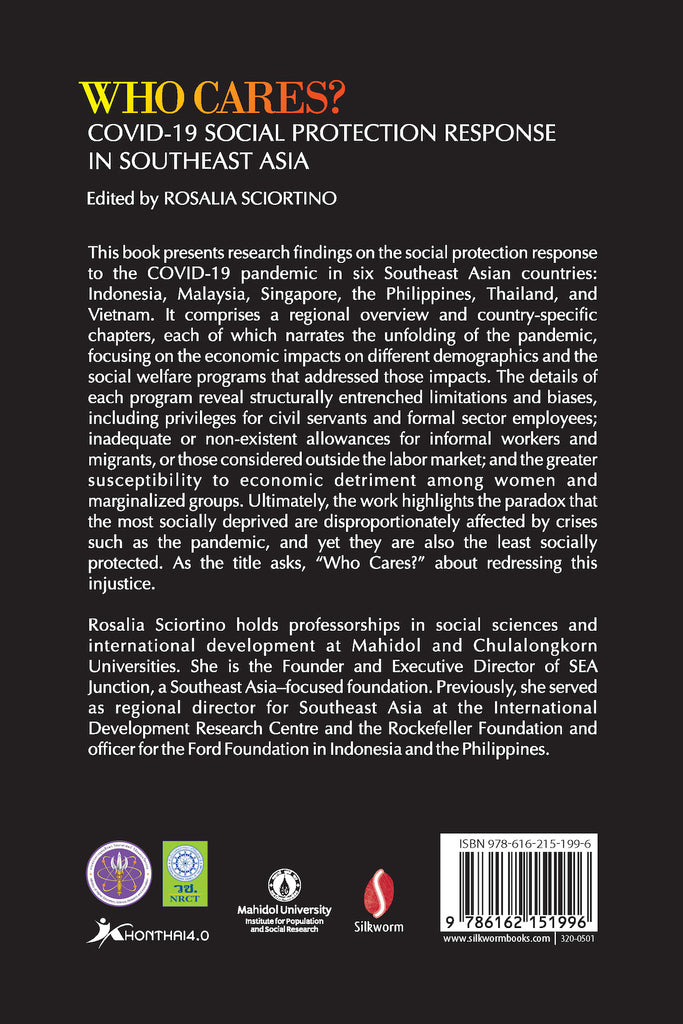 by Rosalia SciortinoWho Cares? This book presents research findings on the social protection response to the COVID-19 pandemic in six Southeast Asian countries: Indonesia, Malaysia, Singapore, the Philippines, Thailand, and Vietnam. It comprises a regional overview and country-specific chapters, each of which narrates the unfolding of the pandemic, focusing on the economic impacts on different demographics and the social welfare programs that addressed those impacts. The details of each program reveal structurally entrenched limitations and biases, including privileges for civil servants and formal sector employees; inadequate or non-existent allowances for informal workers and migrants, or those considered outside the labor market; and the greater susceptibility to economic detriment among women and marginalized groups. Ultimately, the work highlights the paradox that the most socially deprived are disproportionately affected by crises such as the pandemic, yet they are also the least socially protected. As the title asks, “Who Cares?” about redressing this injustice.