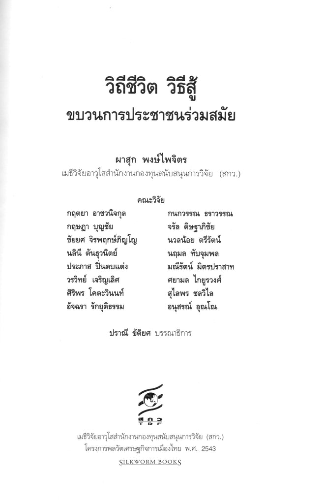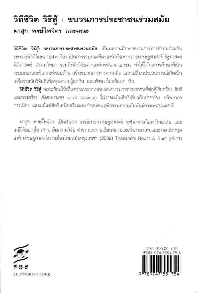 by ผาสุก พงษ์ไพจิตร และคณะวิถีชีวิต วิธีสู้: ขบวนการประชาชนร่วมสมัย เป็นผลงานขบวนการทางสังคมร่วมกันระหว่างนักวิจัยหลายสาขา เป็นการรวบรวมทีมของนักวิชาการสายเศรษฐศาสตร์ รัฐศาสตร์ นิติศาสตร์ สังคมวิทยา รวมถึงนักวิจัยจากองค์กรพัฒนาเอกชน ทำให้ได้ผลการศึกษาที่เป็นระบบมองและวิเคราะห์รอบด้าน สร้างกระบวนการทางความคิด แลกเปลี่ยนประสบการณ์เกิดเป็นเครือข่ายนักวิจัยที่เพิ่มพูนความรู้แก่กัน และพัฒนาไปพร้อมๆ กัน