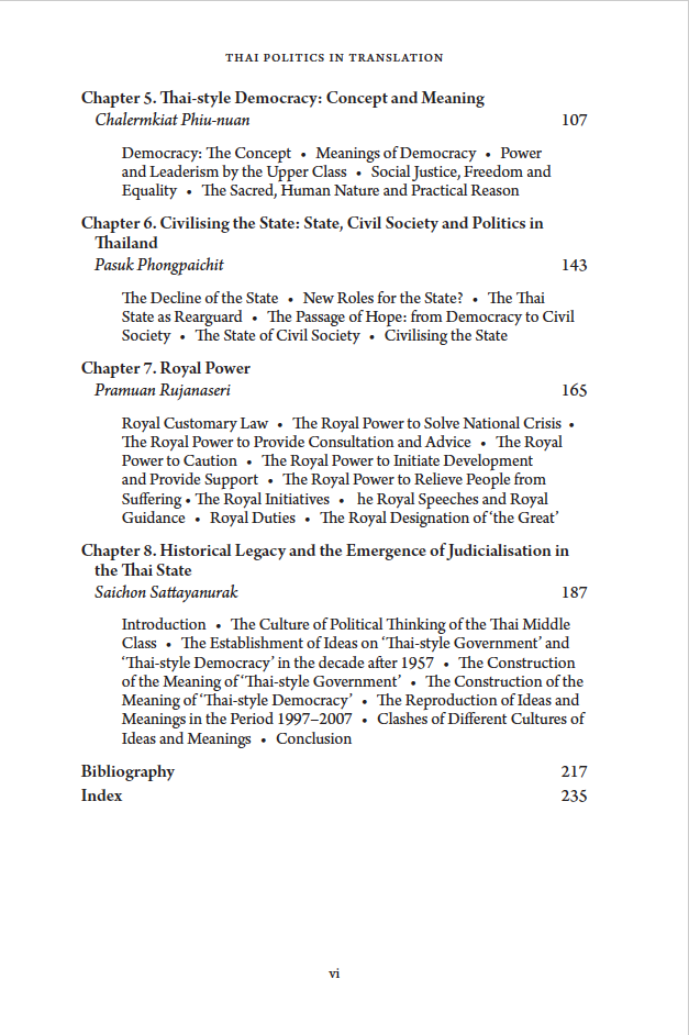 The opening chapter by the editors provides a historical overview of relevant themes and introduces the translated pieces. It also argues that the concept of a supra-constitution – first introduced by legal scholar Somchai Preechasilpakul in a brilliant lecture to the Pridi Banomyong Institute in 2007 – is a powerful frame for interpreting conservative Thai politics. Somchai’s lecture, now translated here, explains that an unwritten supra-constitution sits above the many failed constitutions that litter Thai history. Like a guiding spirit it contains evolving norms on military and monarchical power which circumscribe democratic political contest.