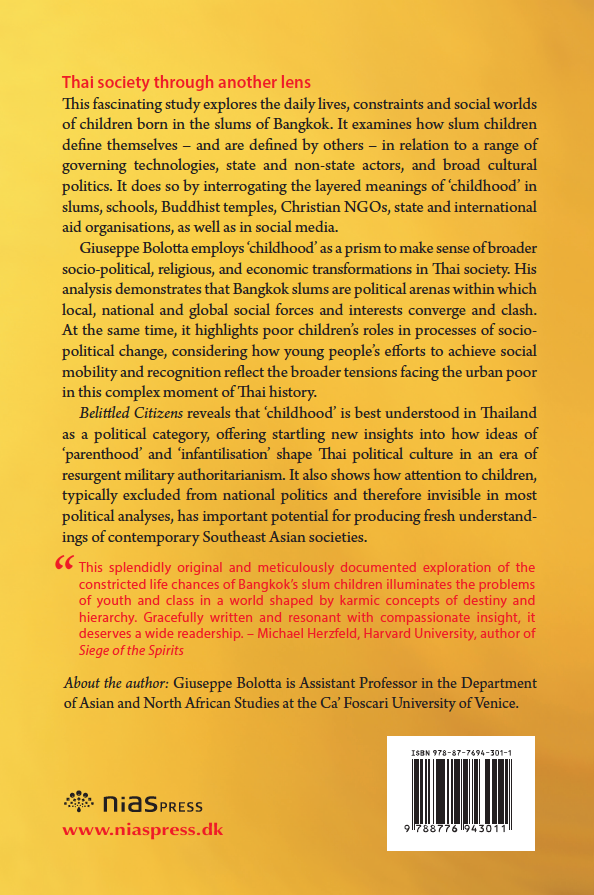 Giuseppe Bolotta employs ‘childhood’ as a prism to make sense of broader socio-political, religious, and economic transformations in Thai society. His analysis demonstrates that Bangkok slums are political arenas within which local, national and global social forces and interests converge and clash.At the same time, it highlights poor children’s roles in processes of sociopolitical change, considering how young people’s efforts to achieve social mobility and recognition reflect the broader tensions facing the urban poor in this complex moment of Thai history.