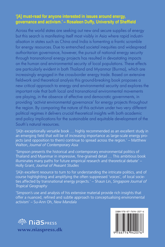 Across the world states are seeking out new and secure supplies of energy but this search is manifesting itself most visibly in Asia where rapid industrialisation in states such as China and India is fomenting a frantic scramble for energy resources. Due to entrenched societal inequities and widespread authoritarian governance, however, the pursuit of national energy security through transnational energy projects has resulted in devastating impacts on the human and environmental security of local populations. These effects are particularly evident in both Thailand and Myanmar (Burma), which are increasingly engaged in the cross-border energy trade. Based on extensive fieldwork and theoretical analysis this ground-breaking book proposes a new critical approach to energy and environmental security and explores the important role that both local and transnational environmental movements are playing, in the absence of effective and democratic governments, in providing ’activist environmental governance’ for energy projects throughout the region. By comparing the nature of this activism under two very different political regimes it delivers crucial theoretical insights with both academic and policy implications for the sustainable and equitable development of the South’s natural resources.